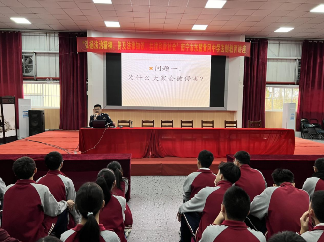 本校讯(通讯员/符澳慧、摄影/黄敔)为了进一步贯彻落实依法治校要求,加强学校普法工作,扎实开展“法治进校园”活动,2月14日,南宁市宏德高级中学(原南宁市东盟黄冈中学)联合高新分局特巡警大队和南宁市公安局情指中心在食报告厅举行“弘扬法治精神,普及法律知识,共建和谐社会”的法制教育讲座。